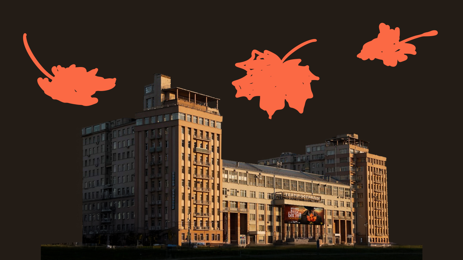 На здании Московского театра эстрады разместили масштабный баннер мюзикла «Вальс-бостон» по песням Александра Розенбаума. Конструкция занимает почти всю площадь фасада и заметна с большого расстояния — афишу можно увидеть даже с Патриаршего моста и с набережной у Храма Христа Спасителя.
